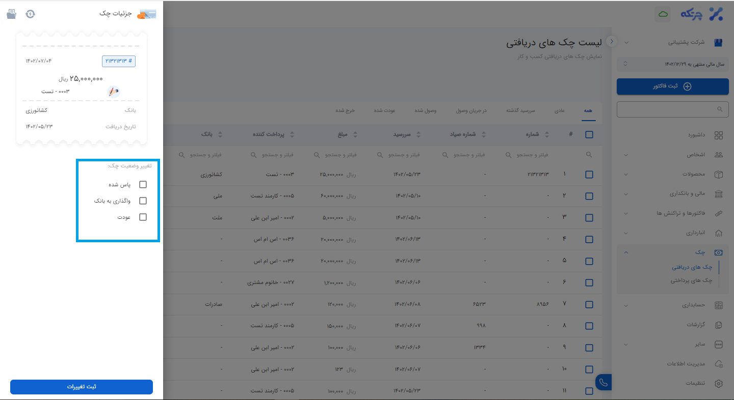 مدیریت چک ها از سربرگ چک که به دو بخش چک های دریافتی و پرداختی تقسیم می شوند، انجام پذیر است