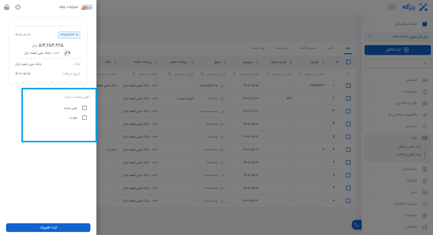 برای مشاهده لیست چک های پرداختی در منوی چک، لیست چک های پرداختی  را کلیک می کنیم. در لیست می توان چک هارا بر اساس وضعیت آن ها فیلتر و مشاهده کرد. چک های عادی چک هایی هستند که در قسمت ثبت تراکنش به ثبت رسیده اند و با استفاده از این قسمت می توان تغییر وضعیت چک ها را اعمال نمود. چک های سر رسید گذشته چک هایی هستند که تاریخ آن ها گذشته است. چک های پاس شده چک هایی هستند که نقد یا پاس شدن و مبلغ آن ها از حساب بانکی کم شده است. عملیات مربوط به چک ها از طریق سه نقطه کنار هر چک در تب همه انجام میپذیرد که با انتخاب گزینه های پاس شده و عودت شده می توان درخواست خود را در سیستم ثبت نمود.