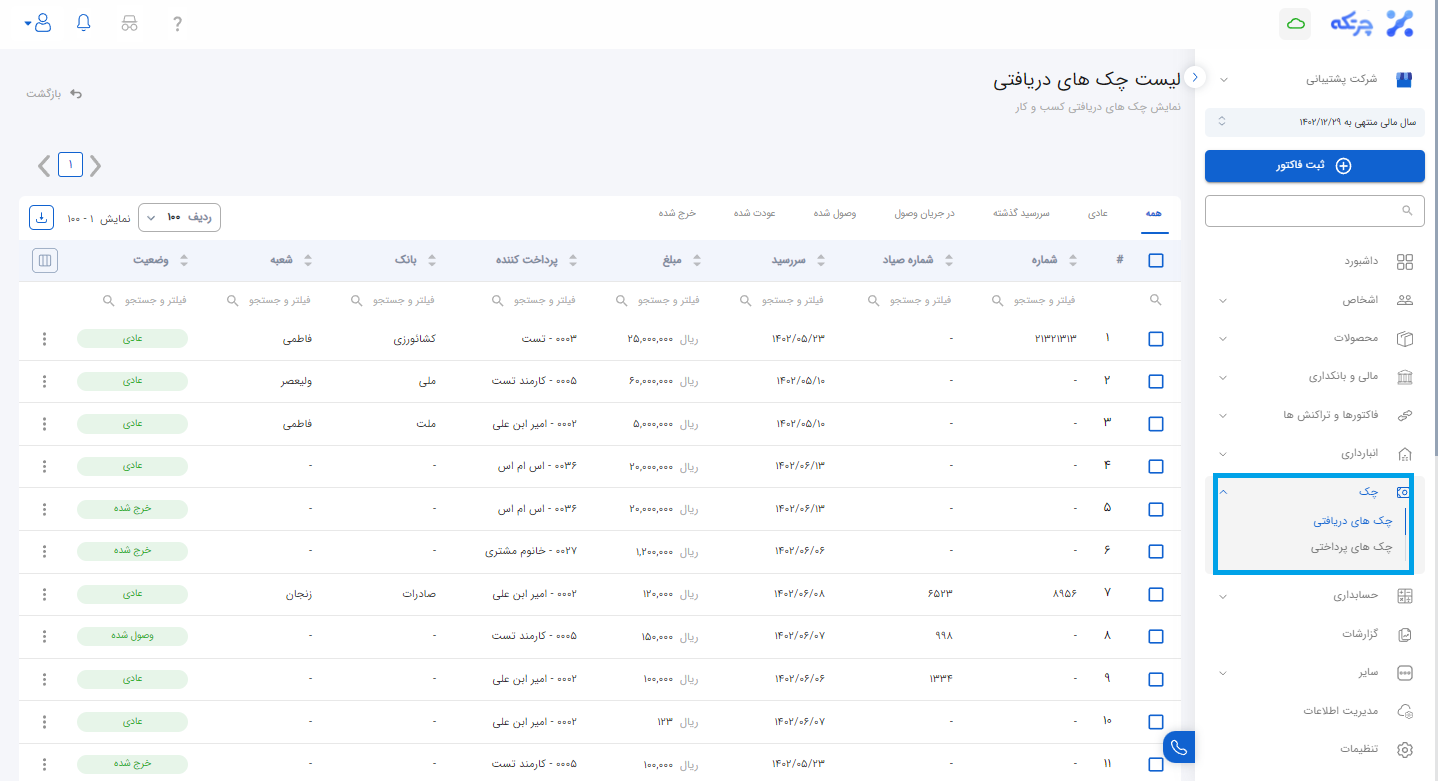 ابتدا در این بخش چک های دریافتی را بررسی می کنیم و سپس عملیات مربوط به چک های دریافتی مانند پاس کردن، واگذاری به بانک، عودت و حذف چک و در نهایت با نحوه خرج چک در چرتکه آشنا می شویم. برای مشاهده لیست چک های دریافتی در منوی چک، لیست چک های دریافتی را کلیک می کنیم. در لیست می توان چک هارا بر اساس وضعیت آن ها فیلتر و مشاهده کرد. چک های عادی چک هایی هستند که در قسمت ثبت تراکنش به ثبت رسیده اند و با استفاده از این قسمت می توان تغییر وضعیت چک ها را اعمال نمود. چک های سر رسید گذشته چک هایی هستند که تاریخ آن ها گذشته است. چک های در جریان وصول چک هایی هستند که به بانک تحویل داده شده اند و در انتظار وصول هستند. چک های وصول شده اصطلاحا به چک هایی گفته می شوند که پاس یا نقد شده اند. چک های عودت داده شده چک هایی هستند که به صادر کننده آن ها برگشت داده شده اند. چک های خرج شده چک هایی هستند که از شخصی دریافت و به جای بدهی یا هر هزینه ای آن را به شخص دیگری داده اید. عملیات مربوط به چک ها از طریق سه نقطه کنار هر چک در تب همه انجام میپذیرد که با انتخاب گزینه های پاس شده، واگذاری به بانک و عودت شده می توان درخواست خود را در سیستم ثبت نمود.