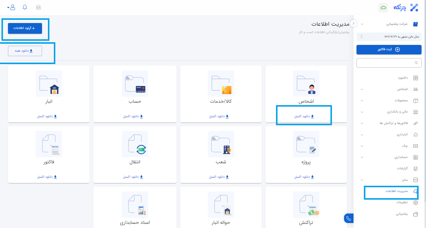 در قسمت مدیریت اطلاعات می توان اکسل تمامی منوهای نرم افزار را از طریق دانلود اکسل ذخیره کرد. با کلیک روی دانلود اکسل، اکسل دقیقی از آیتم مربوطه به شما می دهد. همچنین امکان دانلود اکسل به صورت دسته جمعی از طریق دانلود همه صورت می گیرد. توجه داشته باشید اگر مایل به اضافه کردن مشتری، کارمند، تامین کننده، کالا، خدمات، بانک ها، تنخواه گردان، صندوق و انبار در قالب یک فایل اکسل به نرم افزار هستید این کار در سمت چپ بالای صفحه از طریق آپلود اطلاعات صورت می گیرد. نکته بسیار مهمی که در قسمت آپلود اطلاعات نیاز می باشد استفاده از قالب آماده اکسل در نرم افزار می باشد به این صورت که فایل دلخواه اکسل خود را از طریق مدیریت اطلاعات دانلود نمایید و تمامی اطلاعات جدید را وارد اکسل دانلود شده نمایید.