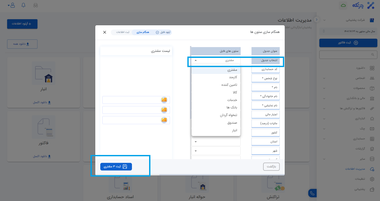 بعد از پر کردن اکسل جدید، با کلیک روی گزینه آپلود اطلاعات، فایل اکسل خود را با زدن دکمه + انتخاب نمایید و به مرحله بعد رفته. از کادر انتخاب جدول زیر منوهای قرار گرفته شده را مشاهده میکنید. برای مثال اگر می خواهید فایل اکسل اشخاص را وارد نرم افزار کنید از کادر انتخاب جدول نوع شخص (مشتری، کارمند، تامین کننده) را انتخاب کنید و تمامی فیلدها را مطابق با درخواست خود پر میکنیم. در نهایت دکمه ثبت را انتخاب میکنیم.