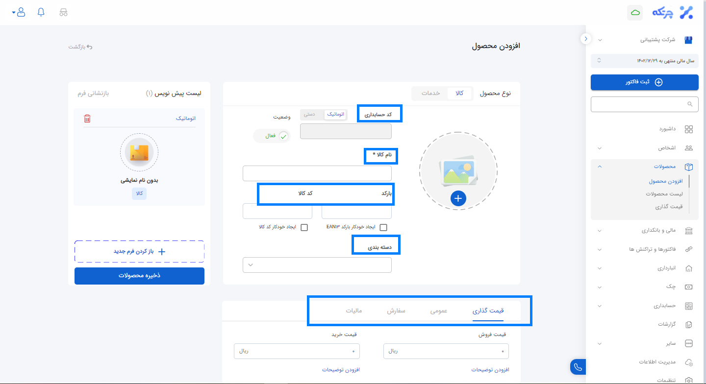 تعریف کالای جدید در چرتکه از منوی محصولات و گزینه افزودن محصول انجام پذیر است به طوریکه تمامی موارد اعم از کد حسابداری، نام کالا، بارکد، کد کالا و … در این بخش تعریف خواهند شد.