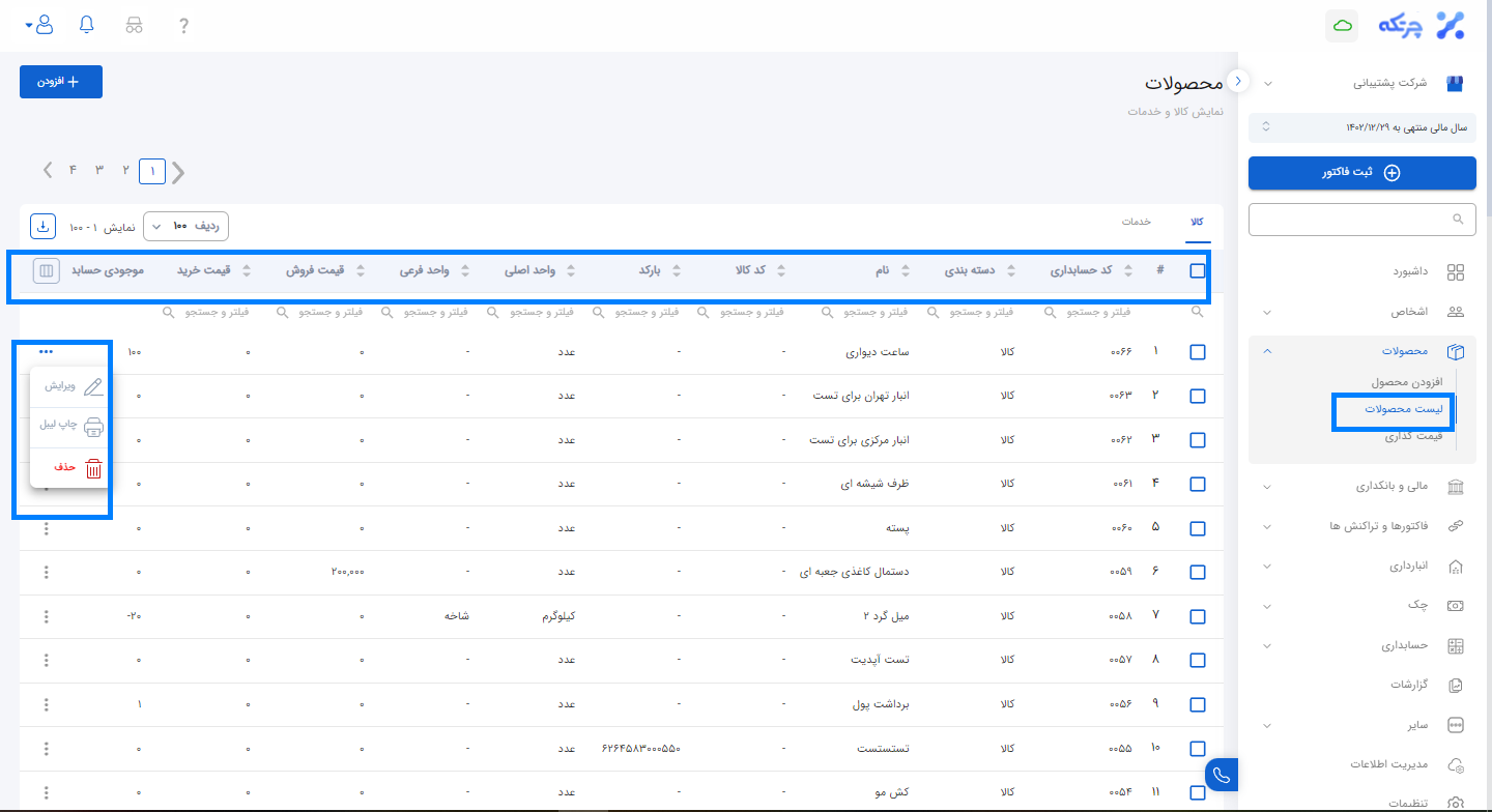 تمامی کالاها و خدماتی که در چرتکه تعریف شده اند را می توان در قسمت لیست محصولات مشاهده نمود. همچنین برای ویرایش، چاپ لیبیل، حذف کالا یا خدمات می توان از طریق سه نقطه کنار محصول فعالیت خود را روی هر محصول به صورت جداگانه انجام داد. دقت داشته باشید کالا یا خدماتی را میتوان حذف نمود که برای آن ها سند، حواله انبار و فاکتوری ثبت نشده باشد در غیر اینصورت ابتدا باید تمامی آن ها را حذف و سپس اقدام به حذف کالای مورد نظر نمایید. همچنین با سرچ در هر کدام از سربرگ های لیست محصول خواسته مورد نظر خود را اعمال نمایید.