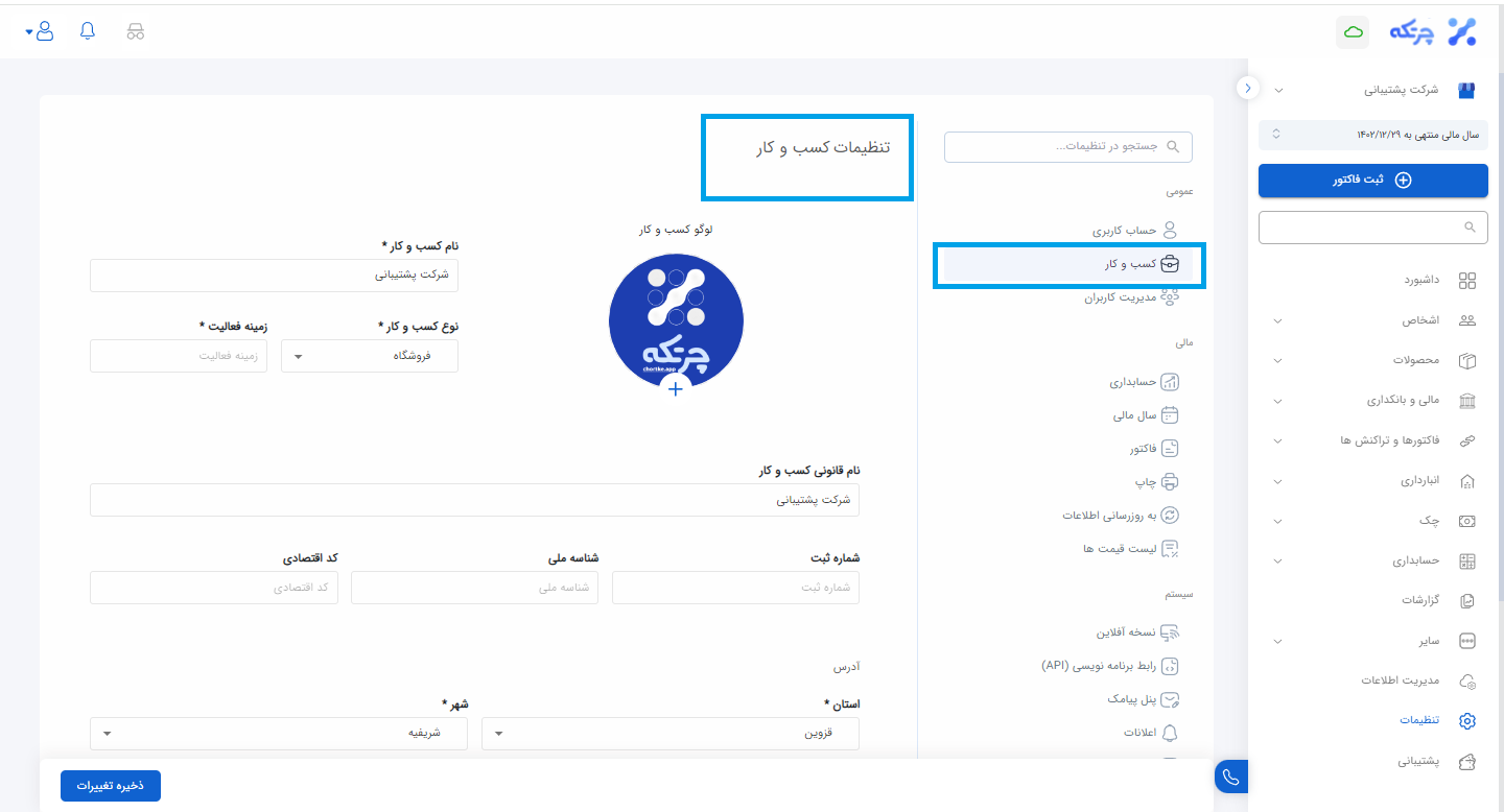در تنظیمات می توان اطلاعات کسب و کاری که قبلا ایجاد شده بود را ویرایش کرد و اگر اطلاعات جدیدی داشته باشیم در سربرگ های مورد نظر اضافه و یا ویرایش نمود.
