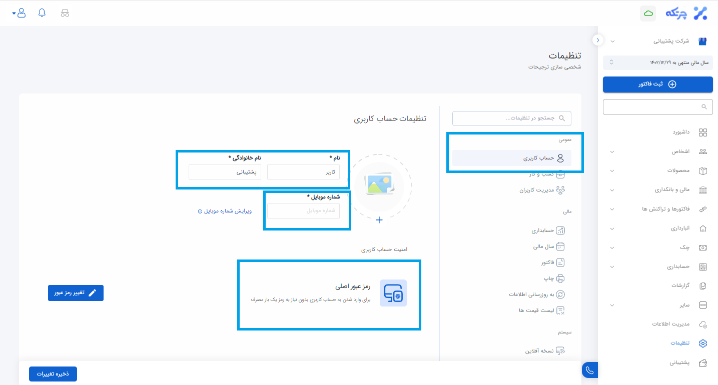 در سربرگ عمومی، قسمت حساب کاربری می توان نام، نام خانوادگی، شماره موبایل و رمز عبور که در همان ابتدای ثبت نام اضافه شده است را تغییر داد.