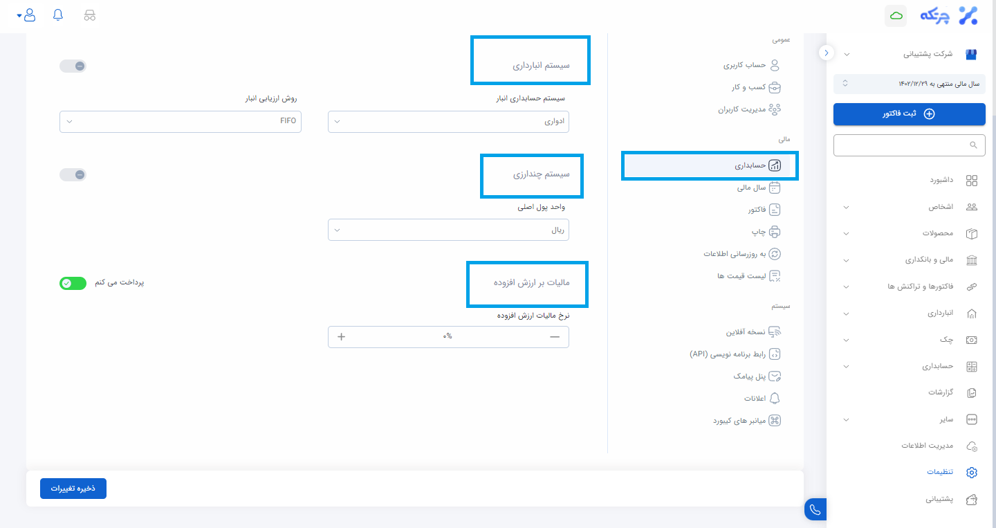 در سربرگ مالی،  قسمت حسابداری می توان تنظیمات مربوط به سیستم انبارداری، سیستم چند ارزی و مالیات بر ارزش افزوده را با روشن کردن تیک آن ها را تغییر داد.