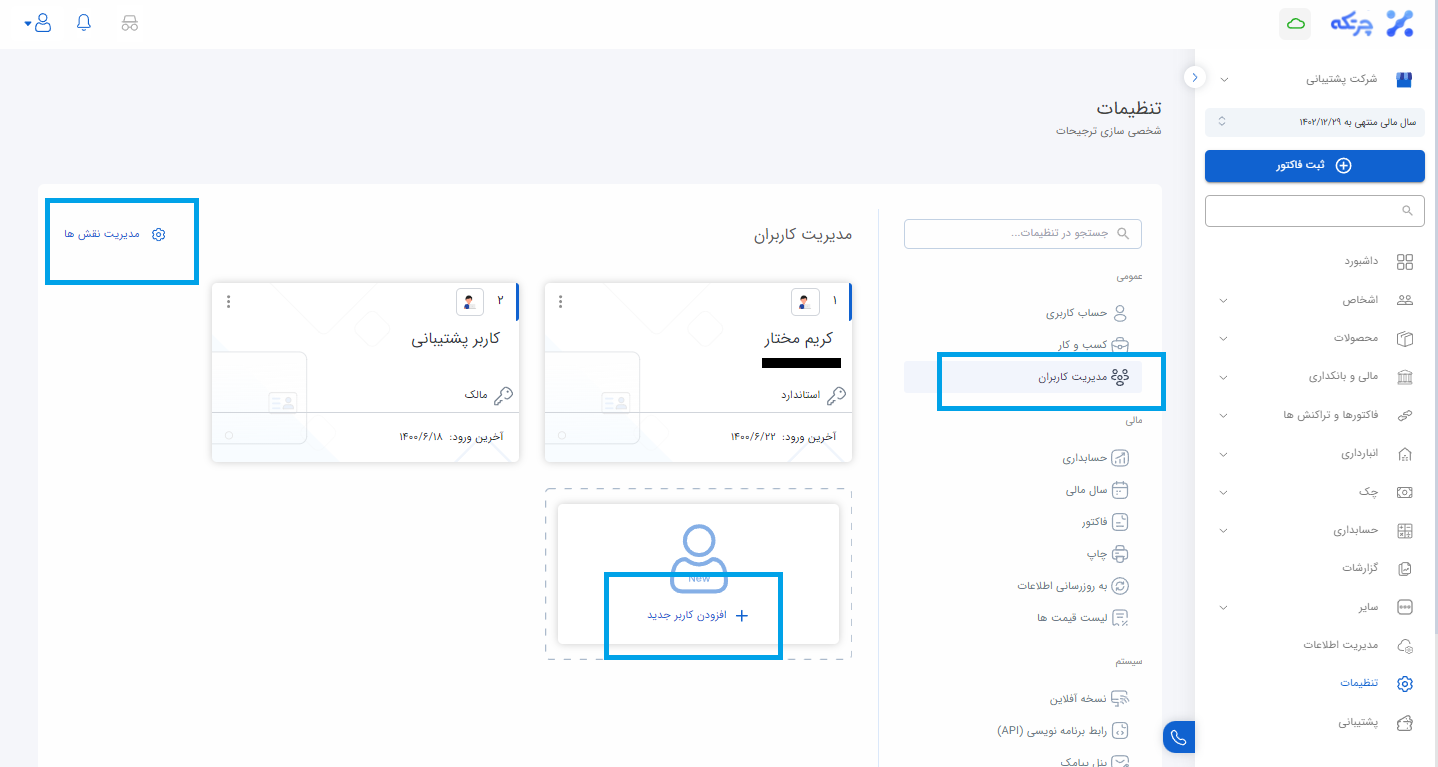 در قسمت مدیریت کاربران، با زدن دکمه افزودن کاربر جدید می توان به کاربر دلخواه، دسترسی مربوطه را اختصاص داد. نکته قابل توجه در این قسمت این است هر کاربری برای سطح دسترسی، باید قبلا در سایت، از قسمت ثبت نام یک حساب کاربری ساخته باشد تا از طریق آن شماره تماس به آن فرد سطح دسترسی داد. همچنین با زدن دکمه مدیریت نقش ها در سمت چپ صفحه، دسترسی جدیدی را برای کاربر فراهم نمود.